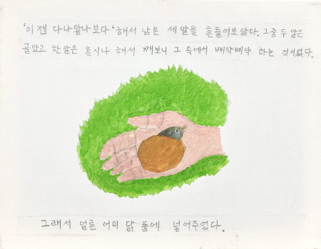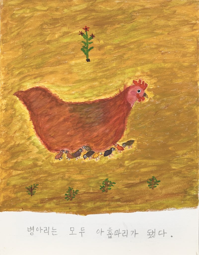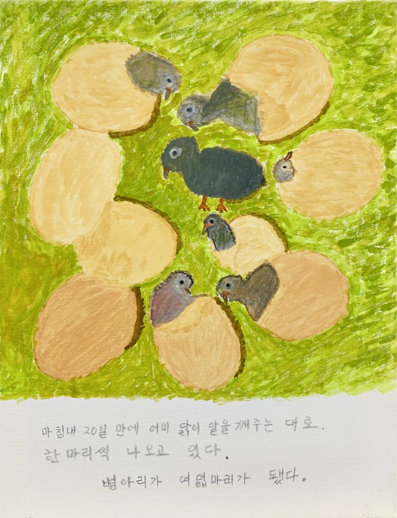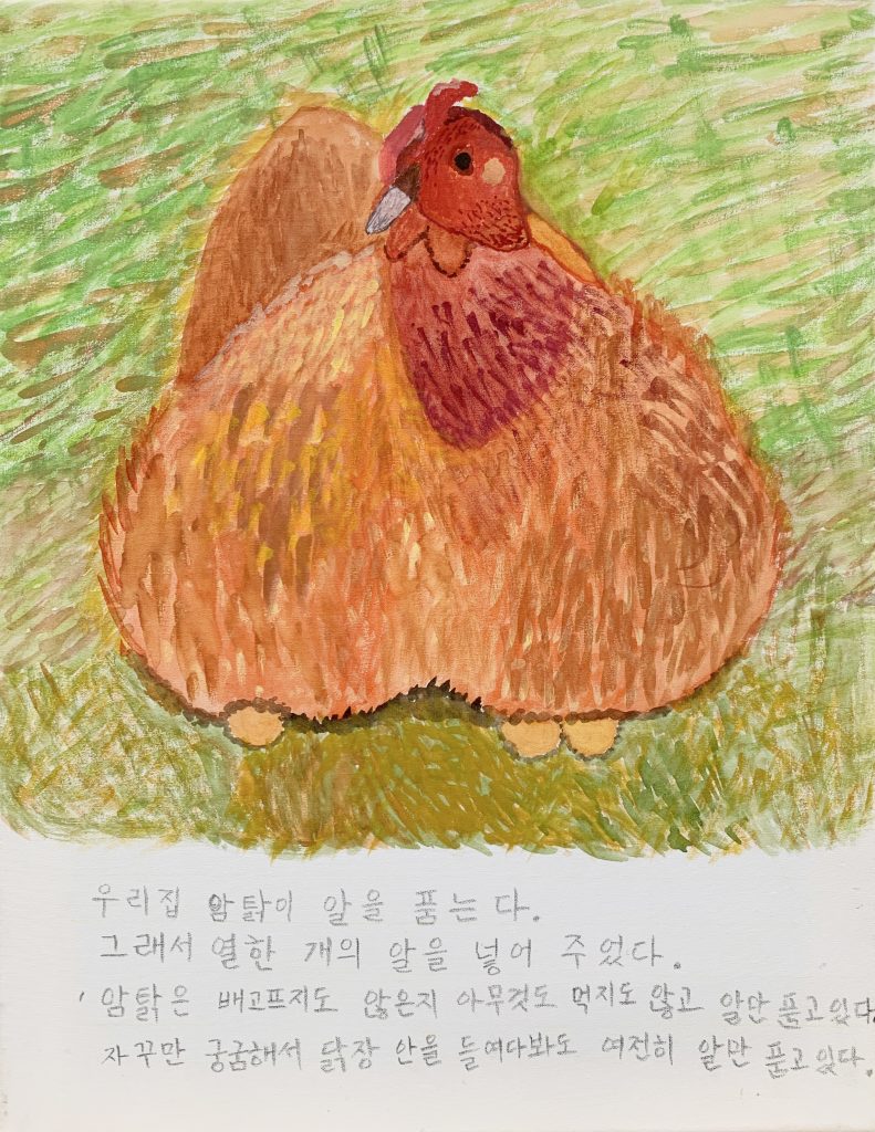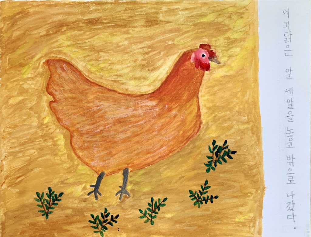 우리집 암탉_2021_캔버스에 수채_41x31.5cm(x2개), 31.5x41cm(x3개)